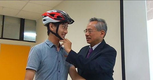 他表示,要正確配戴腳踏車安全帽,最好大小要與頭圍相近,帽沿與眉毛齊,且必須扣上扣環後拉一拉,要有兩個指頭的空間寬度,才能真正保護頭部;他說,推動腳踏車強制戴安全帽入法可以救很多人,但現階段推動不容易,主要是腳踏車該如何攜帶、擺放安全帽,現階段還無法克服,必須進一步找工程單位一起研究;但在這之前,他提醒民眾,可靠夜間反光衣、車前車後燈設置,也可有效降低腳踏車事故、保障安全。